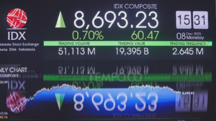INDEKS Harga Saham Gabungan (IHSG) pada pembukaan perdagangan pekan ini, Senin, 15 Desember 2025, menguat 0,09 persen. IHSG pada pembukaan pukul 09.00 menguat ke level 8.715,1 dari penutupan perdagangan pekan kemarin di level 8.660,4.