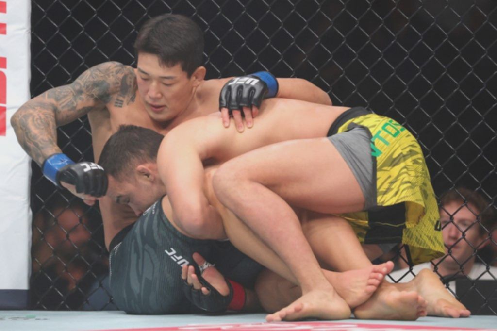 Pertarungan dimulai dengan Daniel Santos melancarkan serangkaian tendangan berputar yang lincah, namun dengan sigap berhasil dihindari oleh Yoo Joo-sang. Merasa di atas angin, Yoo mulai menunjukkan arogansi dengan meledek lawannya di tengah oktagon. Namun, momen tersebut dengan cepat berubah ketika Santos berhasil menangkapnya dan membawa pertarungan ke bawah. Meskipun dalam posisi tertekan, Yoo tetap berakting seolah-olah bosan, meskipun Santos sendiri tidak terlalu agresif dalam posisi tersebut. ‘Zombi Junior’ akhirnya berhasil melepaskan diri, namun tidak luput dari beberapa pukulan keras Santos yang mendarat di kepalanya, menjadi pertanda awal bahaya yang mengancam.