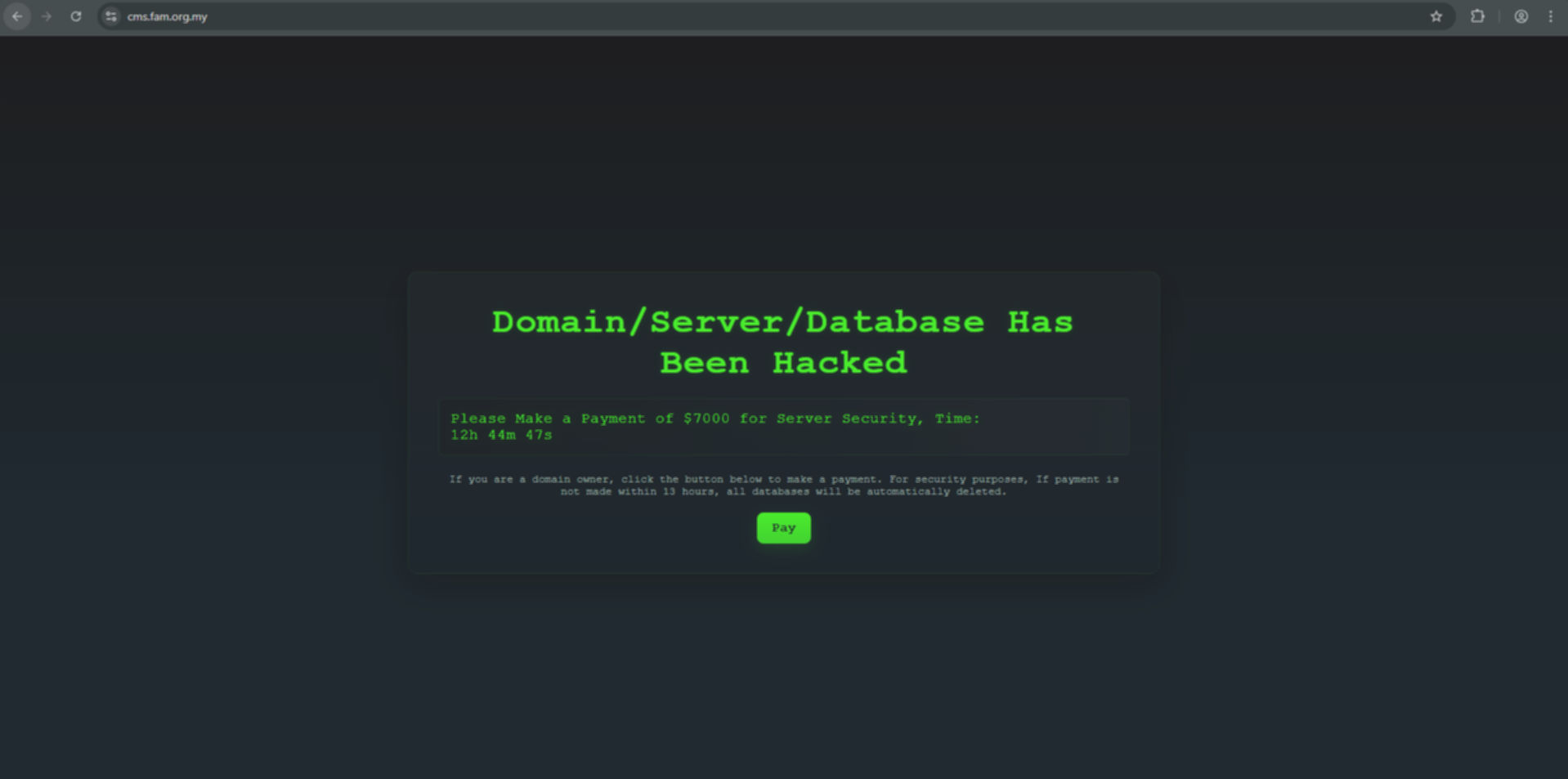 Hingga saat ini, laman cms.fam.org.my masih dalam kendali peretas. Sebuah pesan ancaman tertera: “Tolong lakukan pembayaran senilai 7000 dollar AS untuk keamanan server.” Peretas juga memberikan ultimatum, “Untuk alasan keamanan, jika pembayaran tidak dilakukan dalam 13 jam, semua database akan dihapus otomatis.”